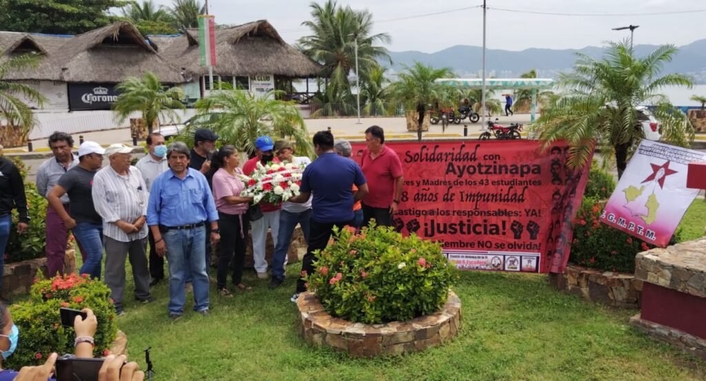 En el anti monumento, los estudiantes colocaron una ofrenda floral y elevaron consignas, pidiendo justicia y que sean localizados sus compañeros, después de ocho años ausentes.