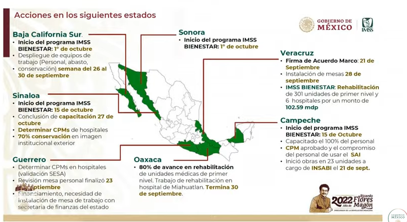 Este martes en la conferencia matutina en Palacio Nacional, el director del IMSS, Zoé Robledo Aburto dio a conocer los avances de la implementación del programa de Salud IMSS-Bienestar en los estados de Nayarit, Tlaxcala, Colima, Baja California, Sonora, Veracruz, Sinaloa, Campeche, Oaxaca y Guerrero.
