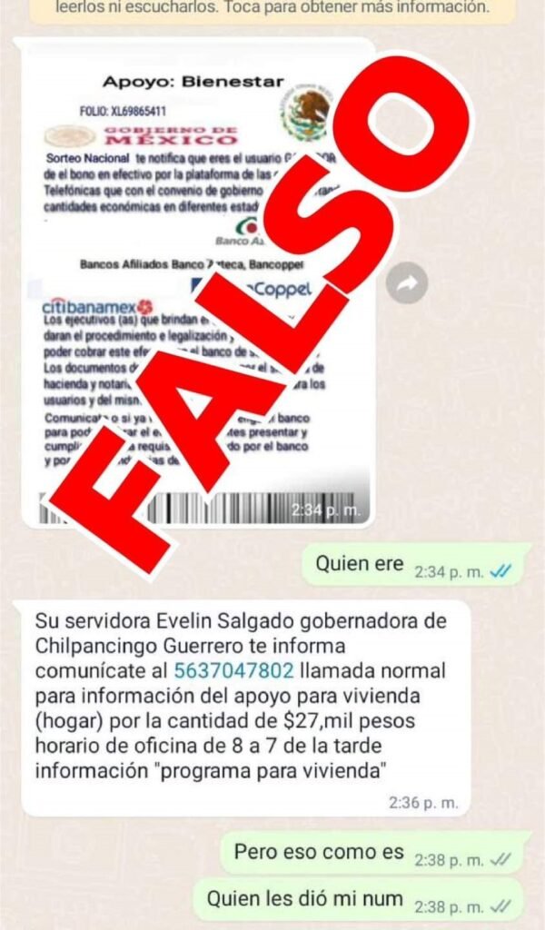 La gobernadora, Evelyn Salgado Pineda alertó a la población de Guerrero, de la existencia de mensajes de WhatsApp falsos a su nombre en donde piden desde 27 mil pesos para poder ser beneficiarios del programa de Bienestar para Vivienda y llamó a no caer en esta estafa.