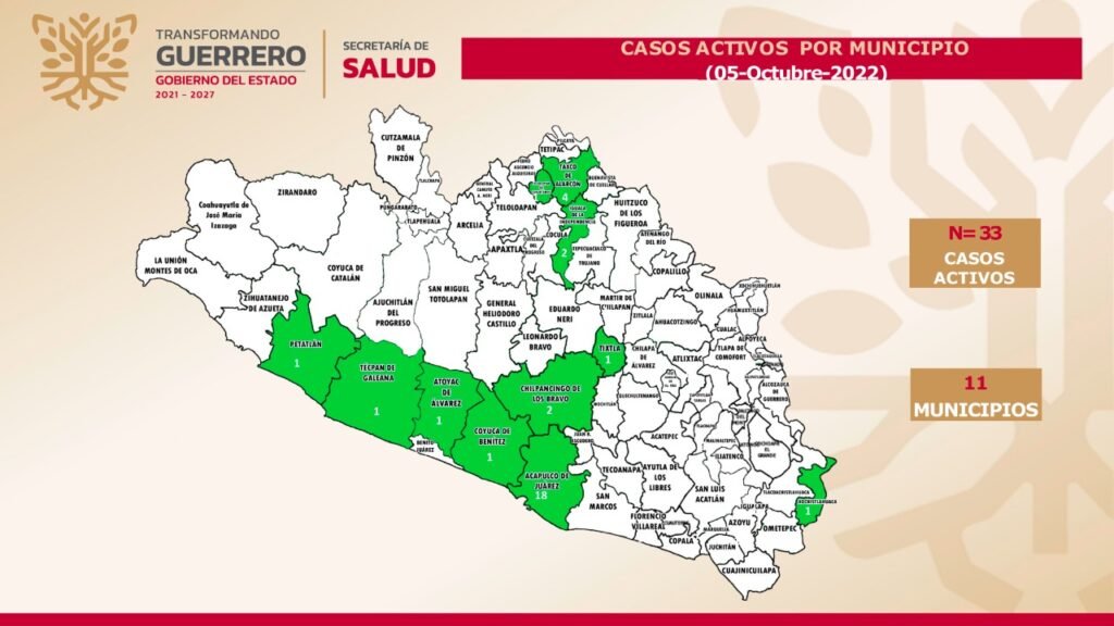 Agregó que la entidad ocupa el lugar 29 a nivel nacional en casos activos, distribuidos en 11 municipios, principalmente Acapulco, con 18; Taxco, 4; Chilpancingo e Iguala, con 2, y Atoyac, Coyuca de Benítez, Ixcateopan, Petatlán, Tecpan, y Tixtla de Guerrero, 1 cada uno.
