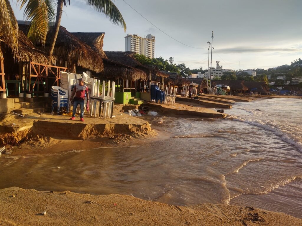 ACAPULCO. —La playa de la icónica Caletilla fue “tragada” por las fuertes marejadas provocadas por las lluvias puntuales fuertes que azotaron a Acapulco la madrugada de este lunes.