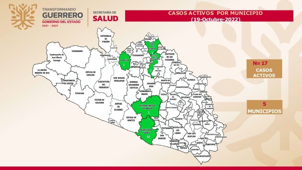 Indicó que los casos activos se localizan en 5 municipios del estado que son Acapulco, con 10; Taxco, 3; Chilpancingo, 2 y Arcelia e Iguala, con 1 cada uno.