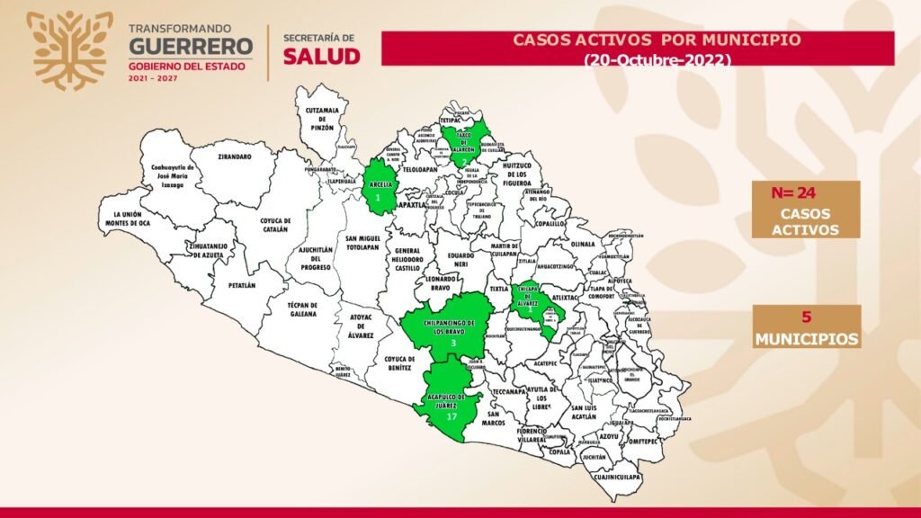 Tras indicar que la ocupación hospitalaria es del 2 por ciento, la dependencia estatal indicó que Guerrero ocupa el lugar 27 a nivel nacional en casos activos, distribuidos en los municipios de Acapulco, con 17; Chilpancingo, 3; Taxco, 2, y Arcelia y Chilapa, con 1 cada uno.