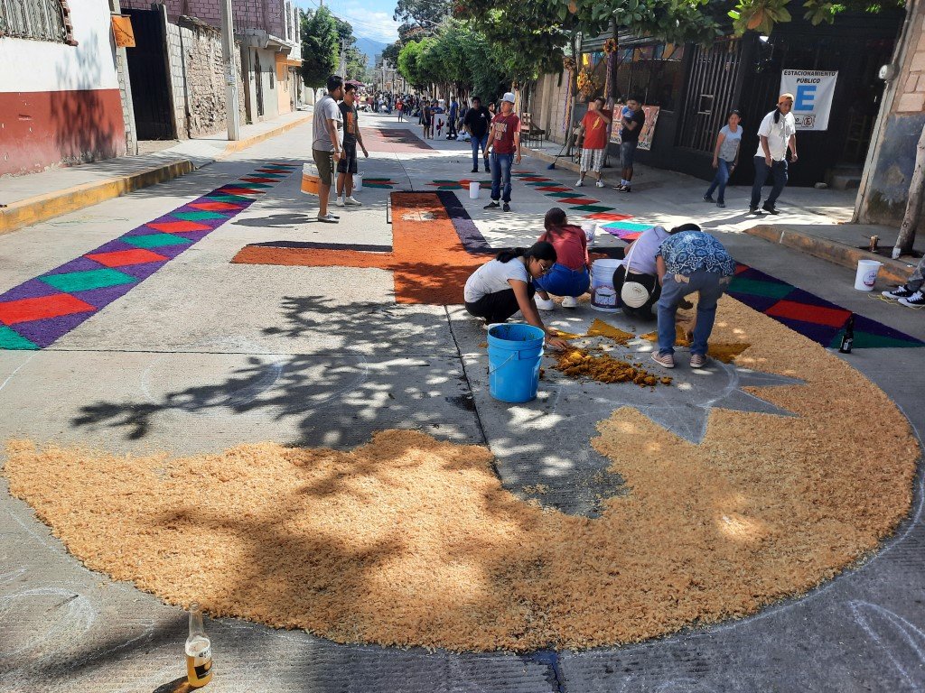Hace dos décadas, los feligreses católicos empezaron a elaborar tapetes de aserrín con imágenes religiosas, con algún mensaje en particular para la peregrinación del Señor del Nicho.