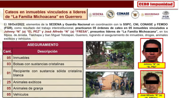 Informó que se catearon 5 inmuebles propiedad de Jhonny Hurtado Olascoaga, “El Pez” y José Alfredo Hurtado Olascoaga “El Fresa”, dirigentes de la FM en la Tierra Caliente y la zona sur del Estado de México.