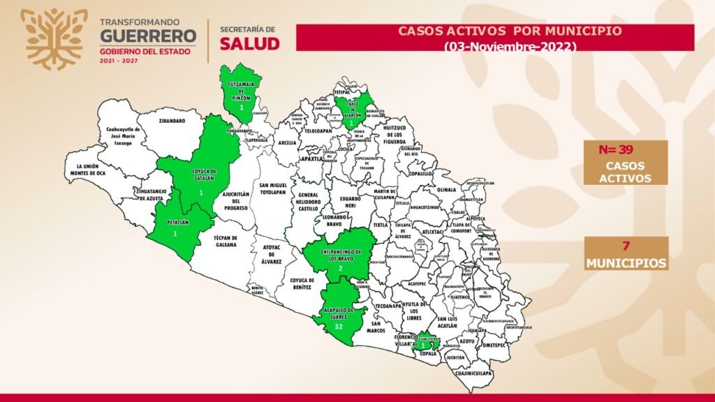 Guerrero ocupa el lugar 25 a nivel nacional en casos activos, distribuidos en 7 municipios: Acapulco 32; Chilpancingo 2; Coyuca de Catalán, 1; Cuautepec, 1; Cutzamala 1; Petatlán, 1 y Taxco 1, esto de acuerdo al informe que emite de manera diaria la Secretaría de Salud Estatal.
