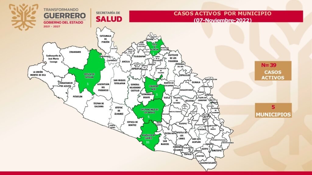 La Secretaría de Salud Guerrero (SSG) informó que al 06 de noviembre, se reportan 39 casos activos de Covid-19, sin registro de defunciones en las últimas 24 horas, manteniendo una ocupación hospitalaria del 1 por ciento.