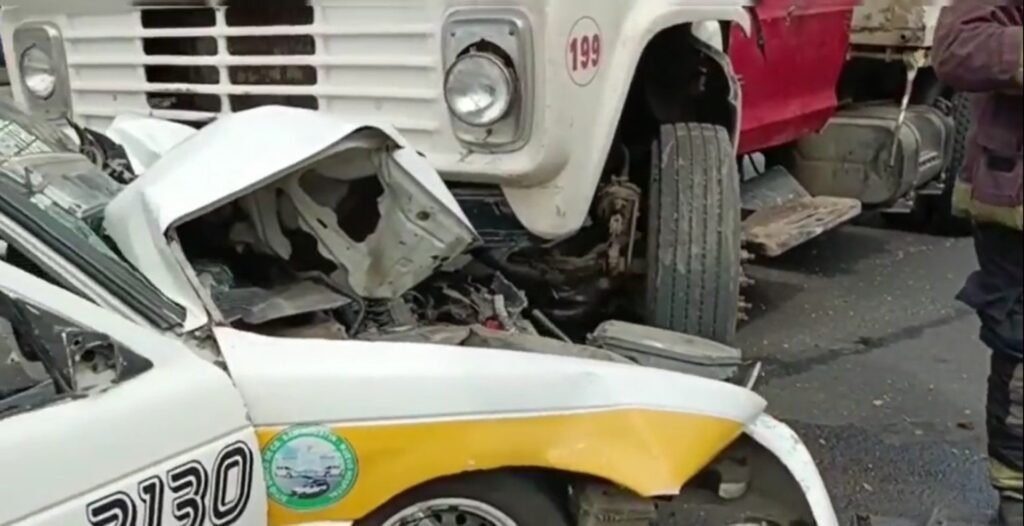De acuerdo con información de las autoridades, en el choque estuvieron involucrados un camión de volteo que se impactó de frente contra un taxi colectivo amarillo con blanco.