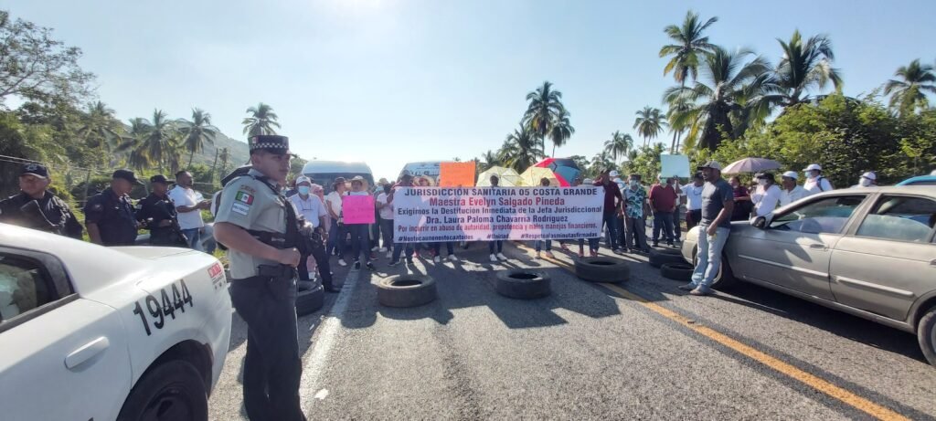 Por espacio de dos horas, trabajadores sindicalizados del Sector Salud que laboran en la jurisdicción sanitaria 05, región Costa Grande, bloquearon la carretera federal, en la comunidad de Aguas Blancas,en el municipio de Tecpan de Galeana, para pedir a la gobernadora Evelyn Salgado, la salida de la jefa jurisdiccional, Blanca Paloma Chavarría Rodríguez.