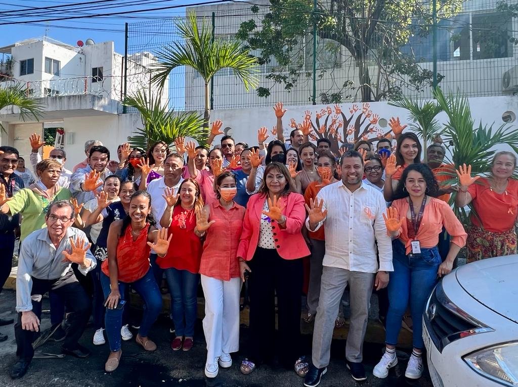 El mural simbólico quedó plasmado en la pared como un árbol de vida con las manos naranjas y frases en conmemoración del Día Internacional para la Eliminación de la Violencia contra las Mujeres y Día de los Derechos Humanos.