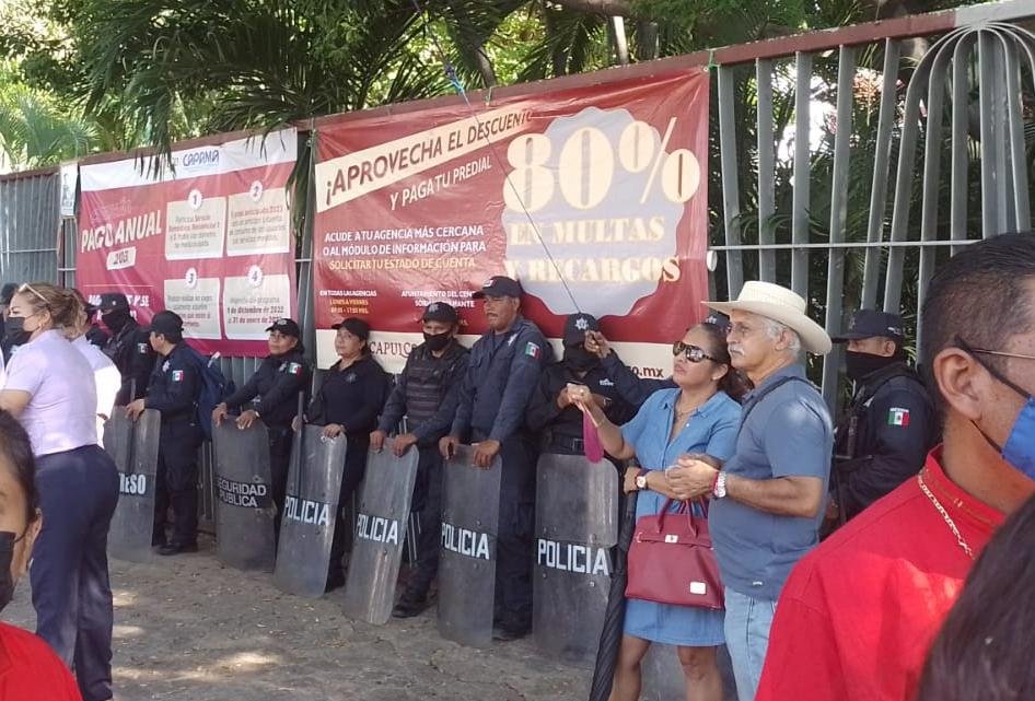 Policías municipales con equipo antimotines resguardaron el acceso al Palacio Municipal de Acapulco, para impedir que ingresaran los dirigentes de la Sección 23 del Sindicato Independiente, que no está reconocido por las autoridades.