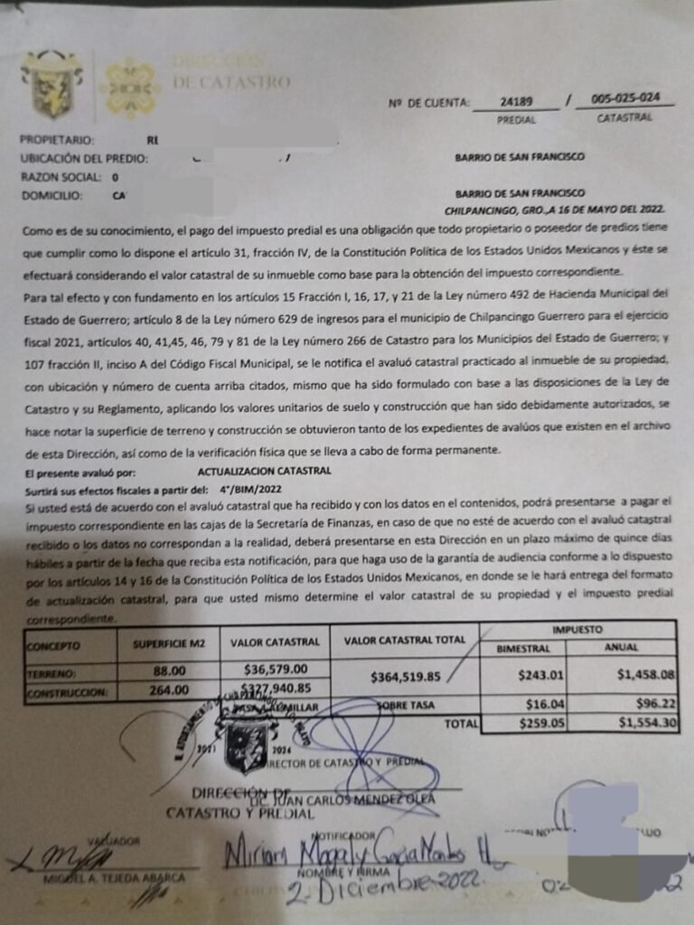 En el escrito de notificación a los contribuyentes se les indica que han sido notificados del “avalúo catastral practicado al inmueble de su propiedad con ubicación y número de cuenta arriba citados, mismo que ha sido formulado con base a las disposiciones de la Ley de Catastro y su Reglamento, aplicando los valores unitarios de suelo y construcción que han sido debidamente autorizados”, lo cual es falso, pues en los últimos años el Congreso del Estado no ha autorizado el incremento al cobro de impuestos en Guerrero y sus municipios.