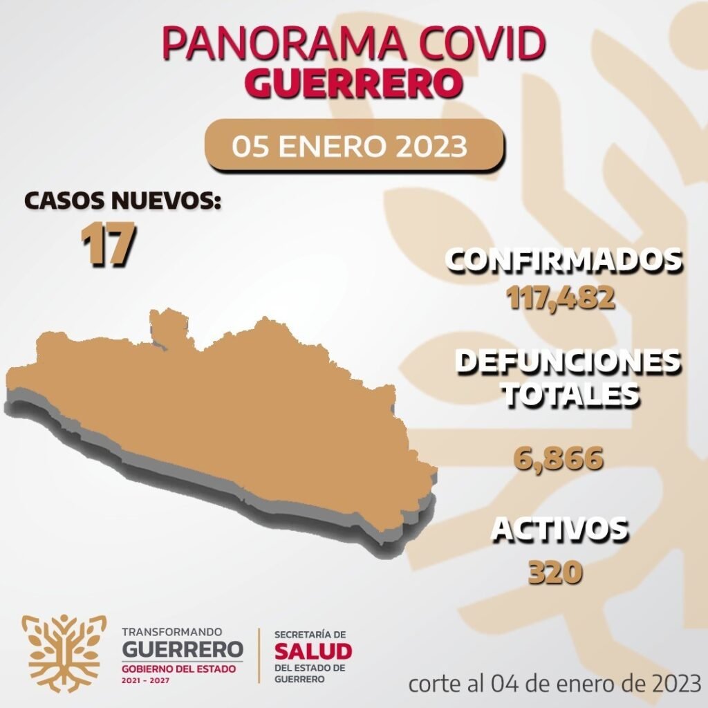 La Secretaría de Salud Guerrero informó que al 04 de enero se reportan 320 casos activos de COVID-19, de los cuales 17 y dos defunciones se confirmaron en las últimas 24 horas.