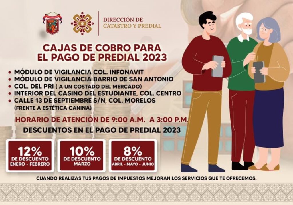 Además se estará dando atención personalizada en las cajas de cobro que estarán ubicadas en el módulo de vigilancia de la colonia Infonavit y del Barrio de San Antonio, así como en el costado del mercado de la Colonia de El PRI, en el interior del Casino del Estudiante y en la calle 13 de septiembre de la colonia Morelos, frente a la estética canina, las cuales estarán atendiendo a la ciudadanía de 9:00 de la mañana a 3:00 de la tarde.