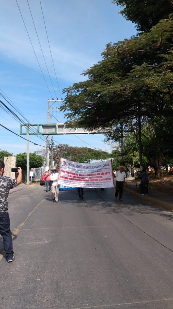 Jubilados y pensionados de la Universidad Autónoma de Guerrero, marchan por principales avenidas de Chilpancingo para exigir el pago del bono decembrino, apoyo para la construcción de la casa del jubilado y apoyo para el pago de las cláusulas 155 y 83.