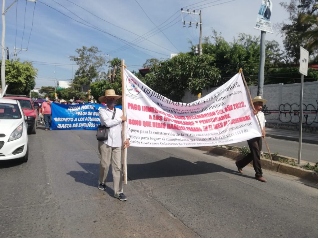 Afiliados a la Asociación de Jubilados y Pensionados de la Universidad Autónoma de Guerrero (UAGro) realizaron una marcha en Chilpancingo que concluyó en la sede del Poder Ejecutivo, donde cerraron los accesos al inmueble para exigir el pago del bono decembrino 2022.