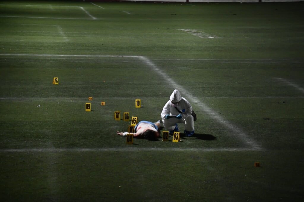 El hecho originó una intensa movilización de policías municipales, estatales y ministeriales quienes confirmaron al llegar al lugar, localizaron a un hombre tendido sobre el pasto, al interior de la cancha de futbol.