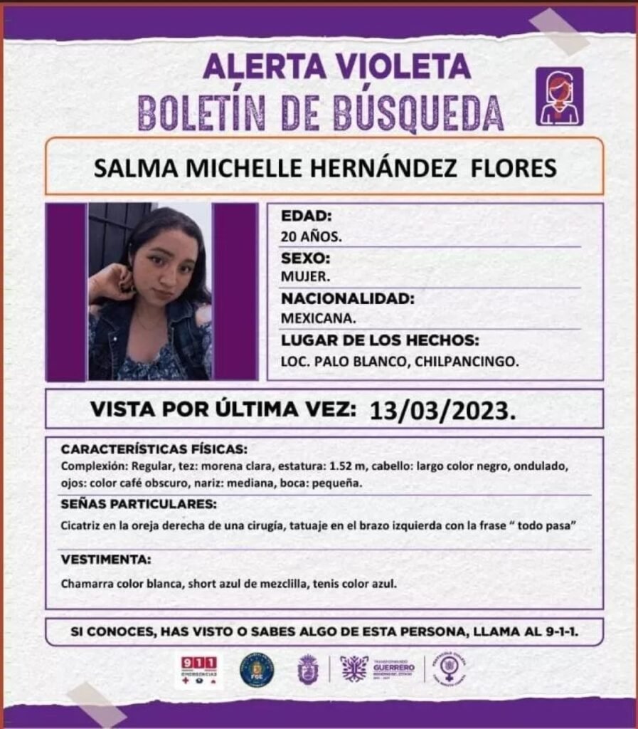 El gobierno del estado activó el protocolo Alerta Violeta para poder localizar a Salma Michelle Hernández Flores, quien fue vista por última vez el lunes 13 del presente mes.
