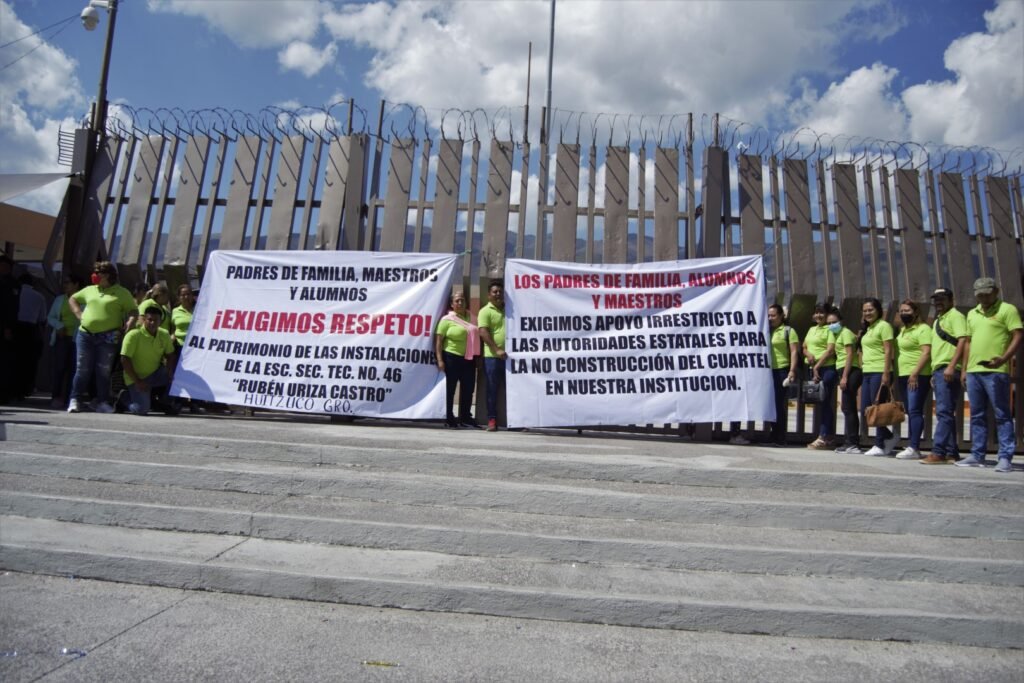 Maestros y padres de alumnos de la Secundaria Técnica 46 ‘Rubén Uriza’ que se ubica en Huitzuco, protestaron afuera de la sede del Poder Ejecutivo en Chilpancingo, para manifestar su rechazo a la iniciativa de construir en terrenos de esa institución educativa, un cuartel de la Guardia Militar.