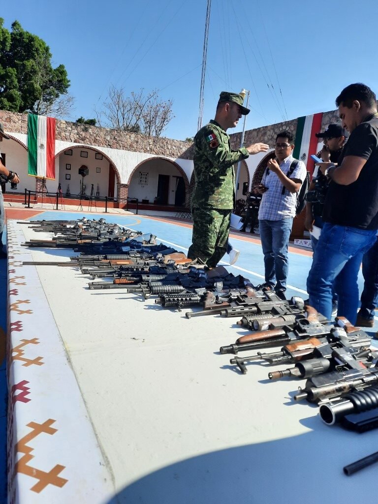 En la explanada donde se realizó el acto se colocaron las 159 armas, donde se pudo apreciar una lanza granadas, fusiles AR-15, AK-47, escopetas y pistolas de diferentes calibres; entre las pistolas se pudieron apreciar algunas que estaban adornadas en las cachas con imágenes de la virgen de Guadalupe, las iniciales chapadas en plata y otras figuras.