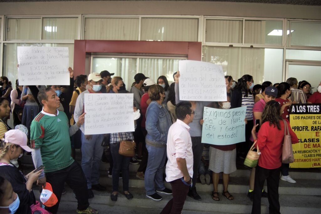 La mañana de este miércoles, maestros y padres de familia de la escuela primaria “Rafael Ramírez Castañeda” y del jardín de niños “Moisés Guevara Villalba”, que se ubican al norte de esta ciudad, tomaron el edificio “Juan N. Álvarez”, donde se encuentran las oficinas de Finanzas, para bloquear el acceso, solicitando la reconstrucción y reubicación de los dos planteles educativos.