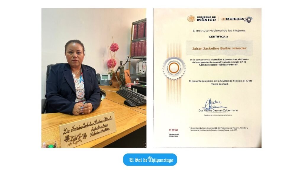 El Instituto Nacional de las Mujeres (INMUJERES), certificó a la licenciada Jairan Jackeline Bailón Méndez, del ISSSTE, para brindar Atención en los casos de Hostigamiento y Acoso Sexual en el sector público federal.