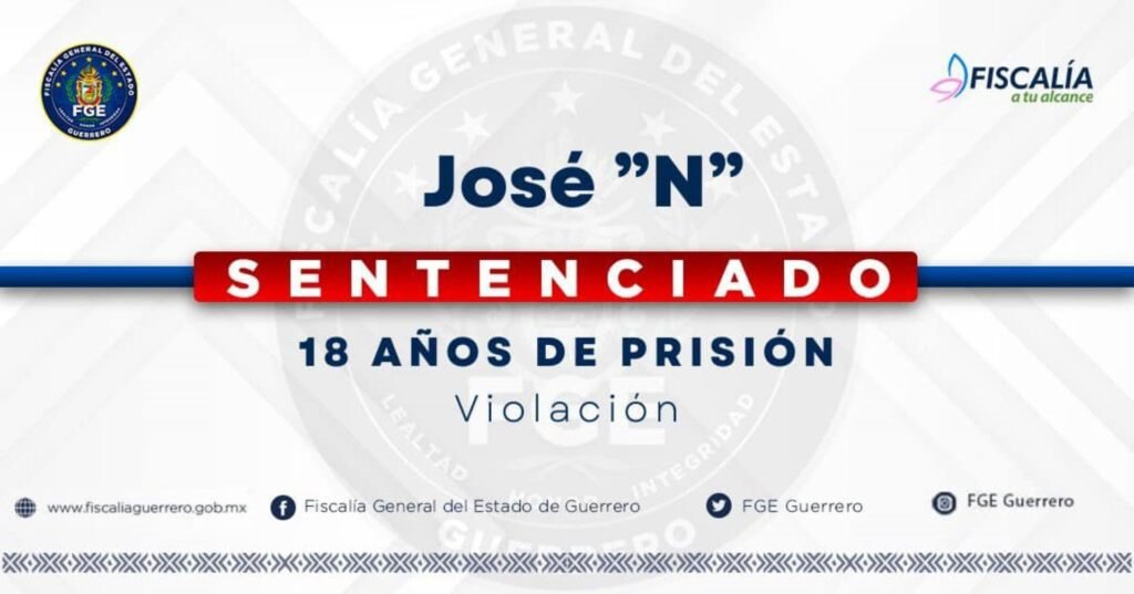 La Fiscalía General del Estado, logró Sentencia Condenatoria en contra de José “N”, por el delito de Violación, cometido en agravio de una víctima cuya identidad se reserva, por los hechos ocurridos en Chilpancingo de los Bravo.