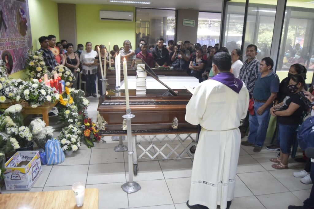 Alrededor de las 12:50 de la llegó la carroza fúnebre a las oficinas del movimiento Antorcha Campesina, ubicadas sobre la avenida Álvarez, fueron ingresados a sus instalaciones y procedieron a realizar una misa con los cuerpos presentes.