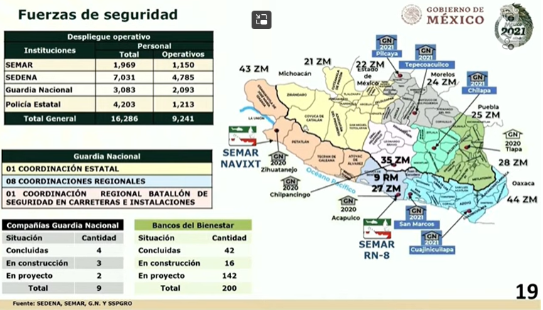 A pesar que en materia de Seguridad el gobierno federal tiene desplegados a personal de la Guardia Nacional (GN), Ejército y Marina en Guerrero al doble de los que disponen las autoridades estatales y municipales, se van a construir más cuarteles y a desplegar más personal para reforzar la estrategia que se aplica en la entidad y en particular en la zona de la Tierra Caliente.