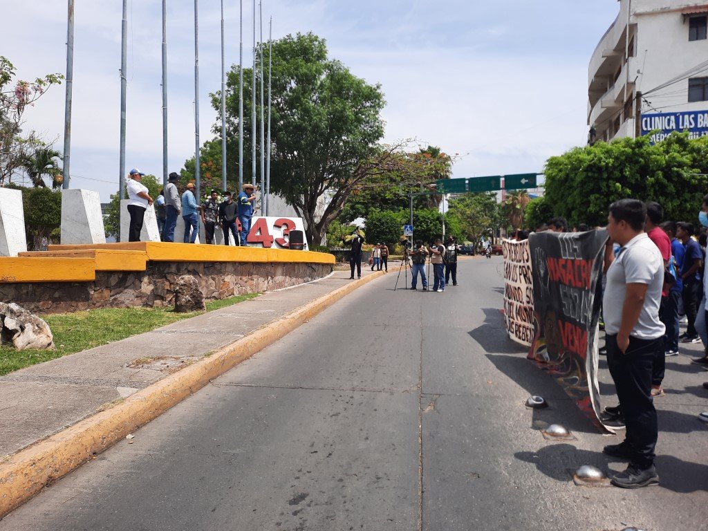 Durante el mitin que duró poco más de una hora, los normalistas bloquearon los cuatro carriles de la avenida Lázaro Cárdenas, lo que provocó caso vial en esa zona de la capital del estado.