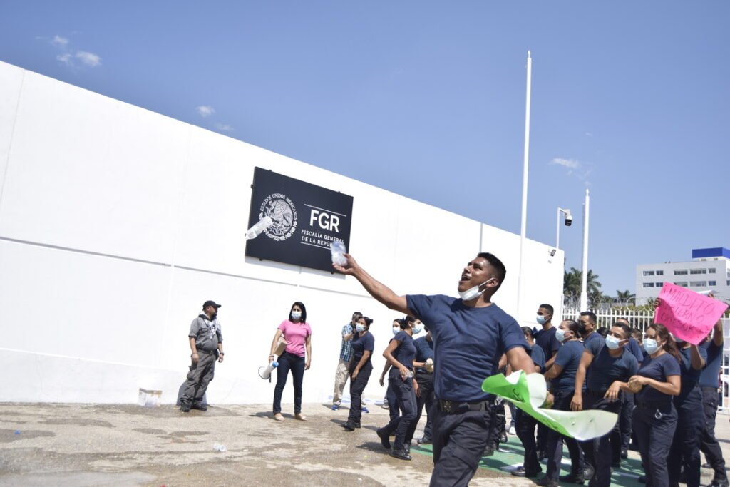 Posteriormente arribarían unos 30 elementos de la policía estatal con equipo antimotines para replegar a los manifestantes y resguardas la entrada de la FGR.