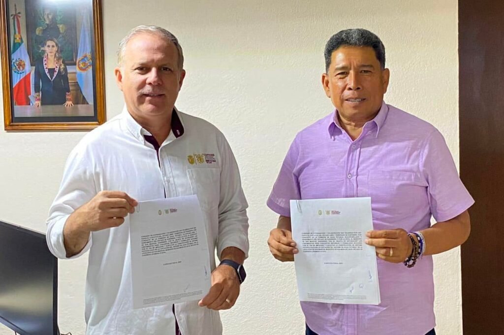 SAN MARCOS. —El alcalde de San Marcos, Tomas Hernández Palma, y el ingeniero Facundo Gastelum Félix, director General de la Comisión de Agua Potable, Alcantarillado y Saneamiento del Estado de Guerrero (CAPASEG), firmaron un convenio para la construcción de una granja solar en Palmitas De Papagayo. El objetivo es reducir los costos de electricidad y generar ahorros para el municipio.