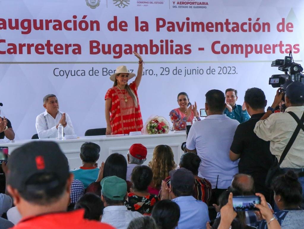 COYUCA DE BENÍTEZ. —En gira por la Costa Grande, la gobernadora Evelyn Salgado inauguró la pavimentación del camino Bugambilias-Compuertas, en donde se invirtieron recursos por cerca de 30 millones de pesos para la pavimentación de un kilómetro lineal en dos carriles, así como las obras adicionales, lo que permitirá acercar los servicios y promover mejores vías de comunicación en beneficio de más de mil 960 habitantes.