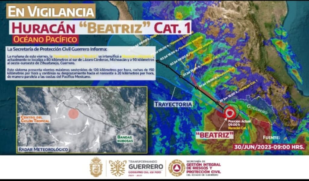 Esta mañana, la Tormenta Tropical “Beatriz” ha ganado fuerza y se ha convertido en un Huracán de categoría 1. Actualmente, se encuentra a 80 kilómetros al sur de Lázaro Cárdenas, Michoacán, y a 90 kilómetros al oeste-suroeste de Zihuatanejo, Guerrero.