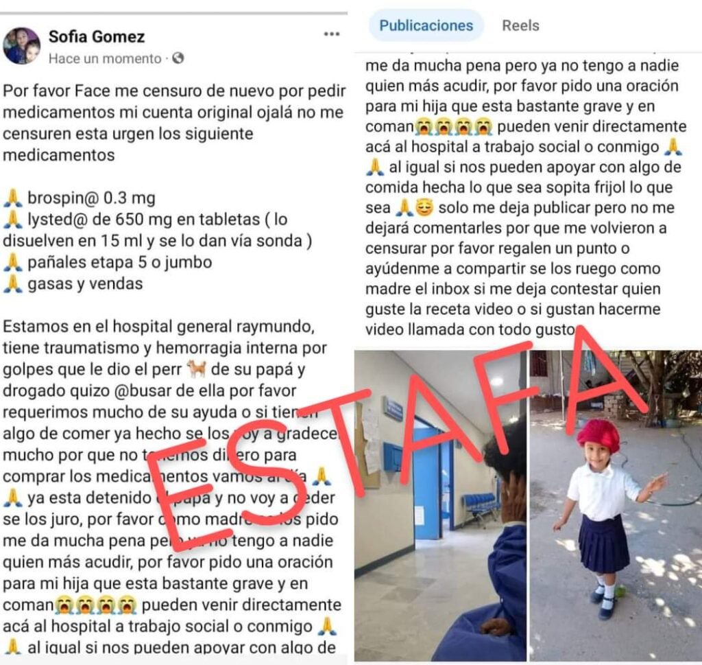 Señaló que en Facebook están pidiendo ayuda “pero es el mismo texto, con diferente nombre de las víctimas y tienen circulando desde ayer. Me mandan otros que son de otros estados que tienen circulando semanas, el mismo texto, diferente nombre de la niña víctima y mamá, dando el nombre de un hospital local”.
