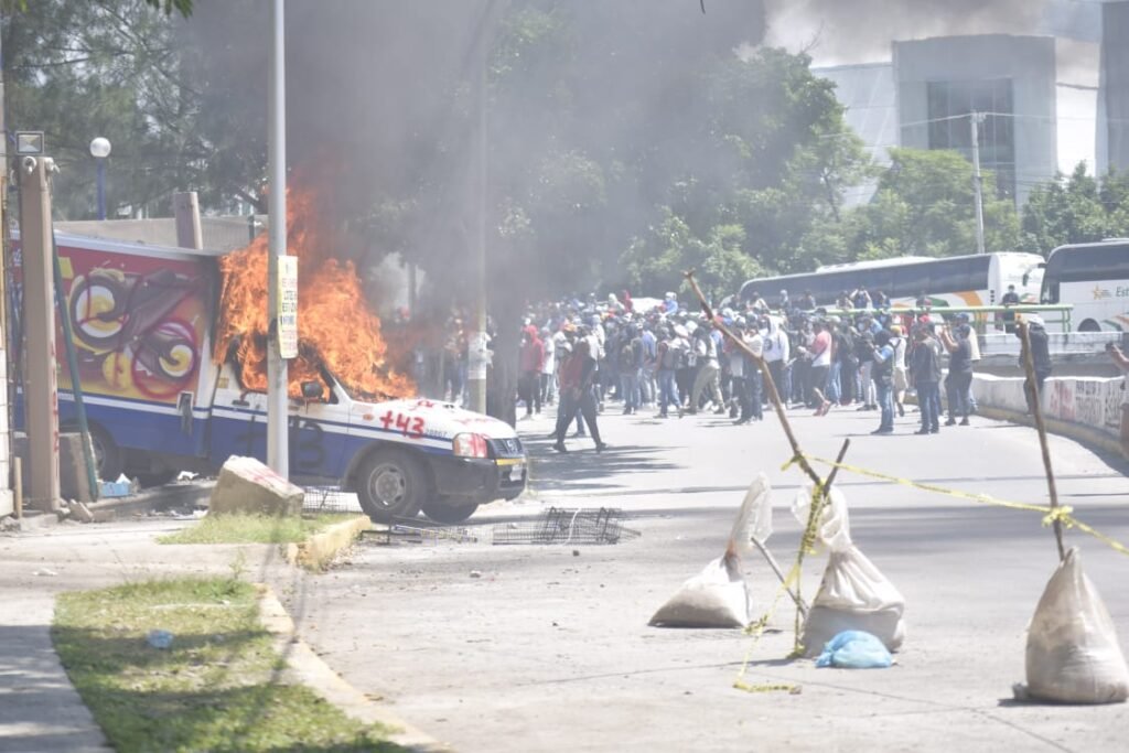 Alrededor de las 2 de la tarde, los estudiantes se retiraron de las instalaciones de la Fiscalía General del Estado después de incendiar la camioneta, lanzando una lluvia de petardos que dañaron varios vehículos estacionados en el interior de las instalaciones.