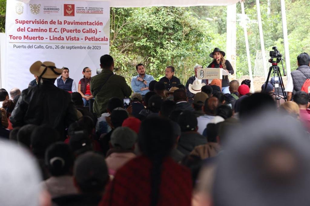 La mandataria estatal encabezó este martes, en la comunidad de Puerto del Gallo, la supervisión de la pavimentación de la carretera Puerto del Gallo-Toro Muerto-Linda Vista-Petlacala, obra en la que se invertirán 5.5 millones de pesos en beneficio de casi 7 mil habitantes de esa zona, que era una solicitud que habían hecho sus pobladores desde hace 22 años.