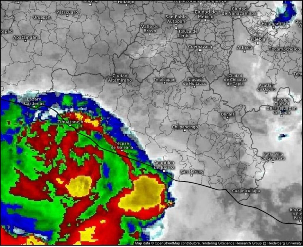 Se espera que durante el día aumente la intensidad de sus vientos y precipitaciones, tocando tierra muy cerca de Zihuatanejo, Guerrero, incrementando sus efectos en el transcurso del día.