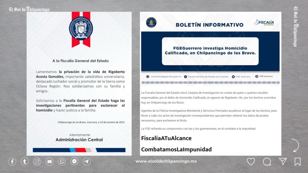 La Universidad Autónoma de Guerrero exigió a la Fiscalía General del Estado que se lleve a cabo una investigación exhaustiva y se esclarezca el homicidio del destacado catedrático, Rigoberto Acosta González, ocurrido el día de ayer frente a la Facultad de Comunicación y Mercadotecnia de esa casa de estudios, donde el occiso ejercía su labor académica.
