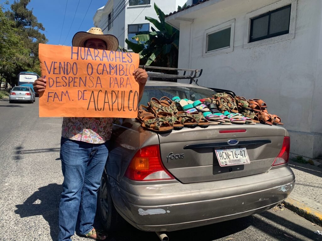Por segunda ocasión José Antonio Molina Serrano, de oficio huarachero y originario del puerto de Acapulco, viajó a la capital del estado y se instaló sobre la lateral del boulevard Vicente Guerrero, a la altura de la terminal de autobuses, para cambiar o vender su producto y así llevar un poco de despensas para los damnificados del puerto.