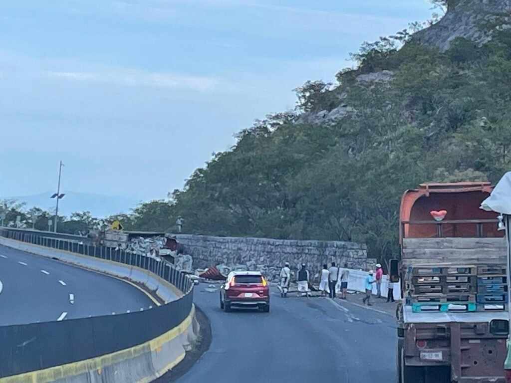 Un tractocamión que circulaba sobre la Autopista del Sol México-Acapulco, volcó cerca del retorno de San Judas, en el municipio de Eduardo Neri.