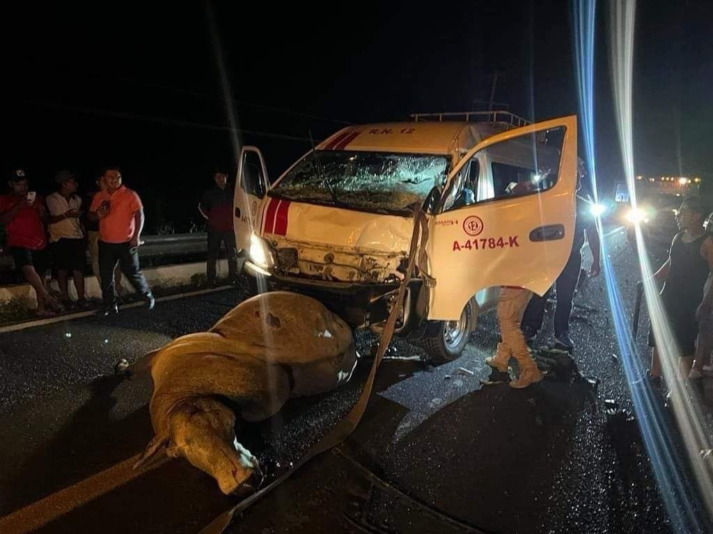 De acuerdo a las autoridades, una vaca caminaba sobre la carretera cuando la urvan, se impactó de frente contra el bovino provocando que el animal muriera de manera instantánea y la unidad, quedará destrozada de la parte frontal.