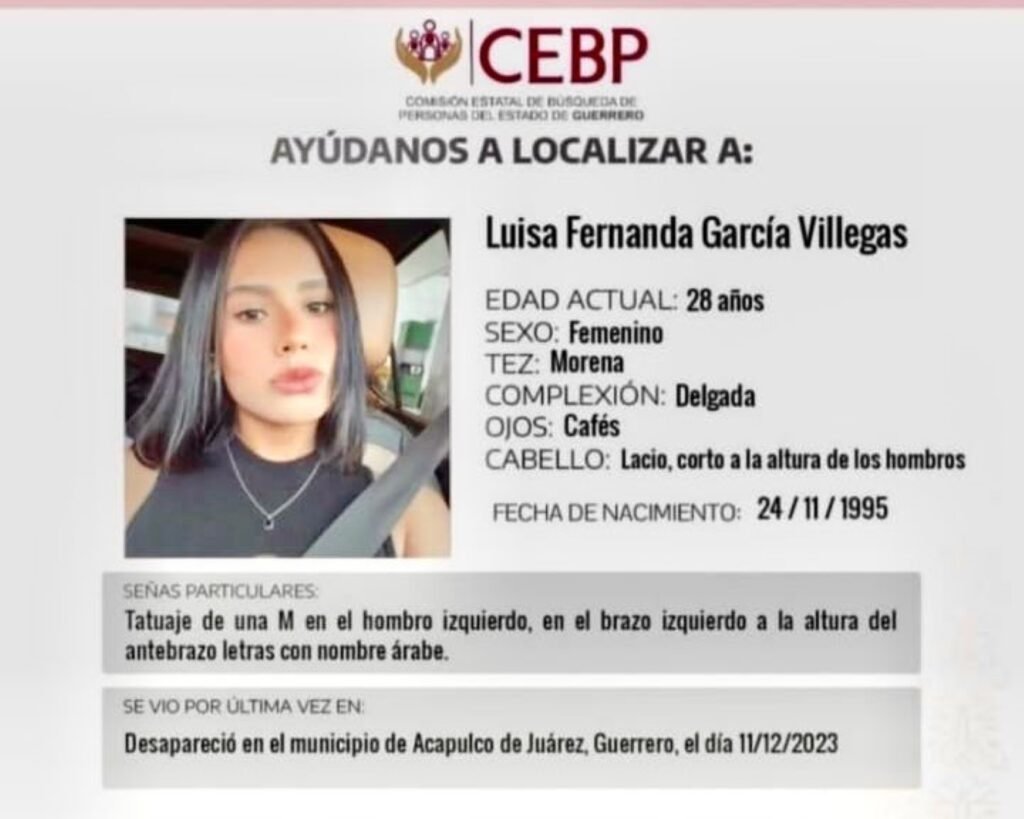 ACAPULCO. —Luisa Fernanda García Villegas, de 28 años, ha sido reportada como desaparecida desde hace tres días en Acapulco, generando preocupación en su círculo social y familiar.