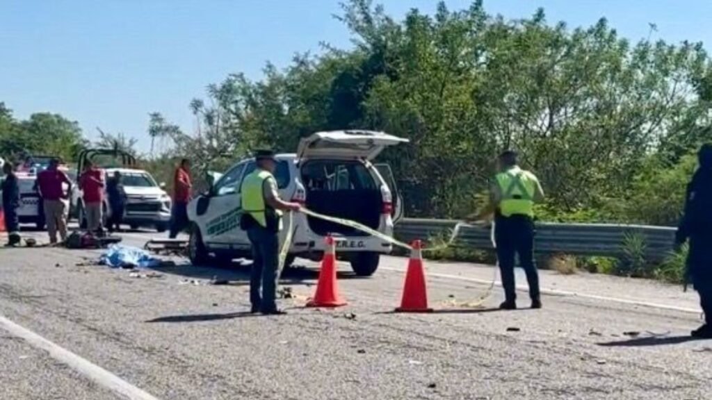 El impacto se dio entre un vehículo de la marca Toyota, tipo Avanza, con cromática de taxi marcado con el número económico 09 del servicio público y una motocicleta cuyo conductor murió y su cuerpo quedó tirado sobre la carpeta asfáltica.