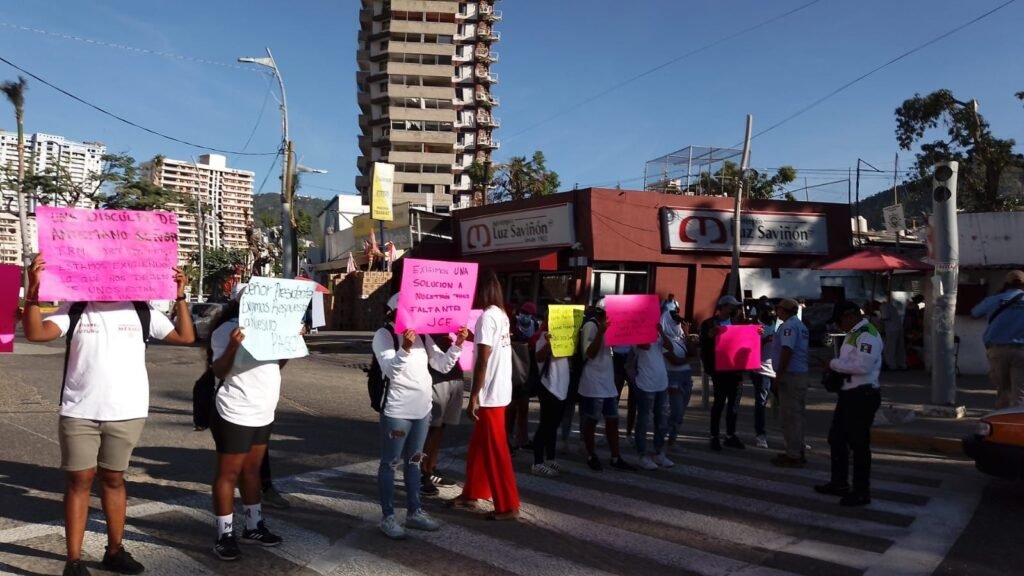 “Estamos aquí porque no nos pagan desde hace dos meses. Nos contrataron para limpiar las calles y casas que quedaron afectadas por el huracán Otis, pero no nos han pagado”, dijo uno de los jóvenes.