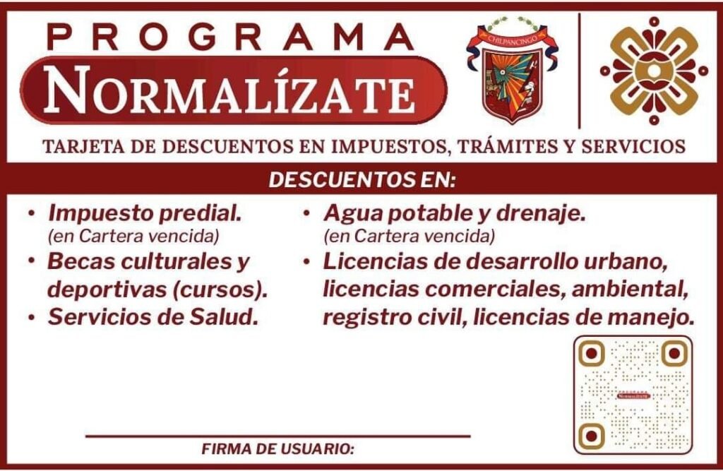 Se otorgarán descuentos especiales a los contribuyentes al corriente en sus pagos, y podrán participar en una rifa programada para finales de marzo. Diversas dependencias municipales, como la Secretaría de Desarrollo Urbano, la Secretaría de Salud Municipal y la Comisión de Agua Potable y Alcantarillado, ofrecerán beneficios con la tarjeta “Normalízate”.