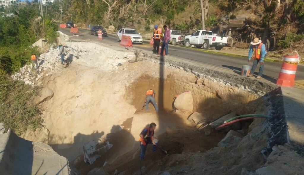 La Comisión de Infraestructura Carretera y Aeroportuaria del Estado de Guerrero sigue con los trabajos para reparar el socavón surgido en la avenida Escénica, ubicado en el puerto de Acapulco, a la altura del condominio Blue.