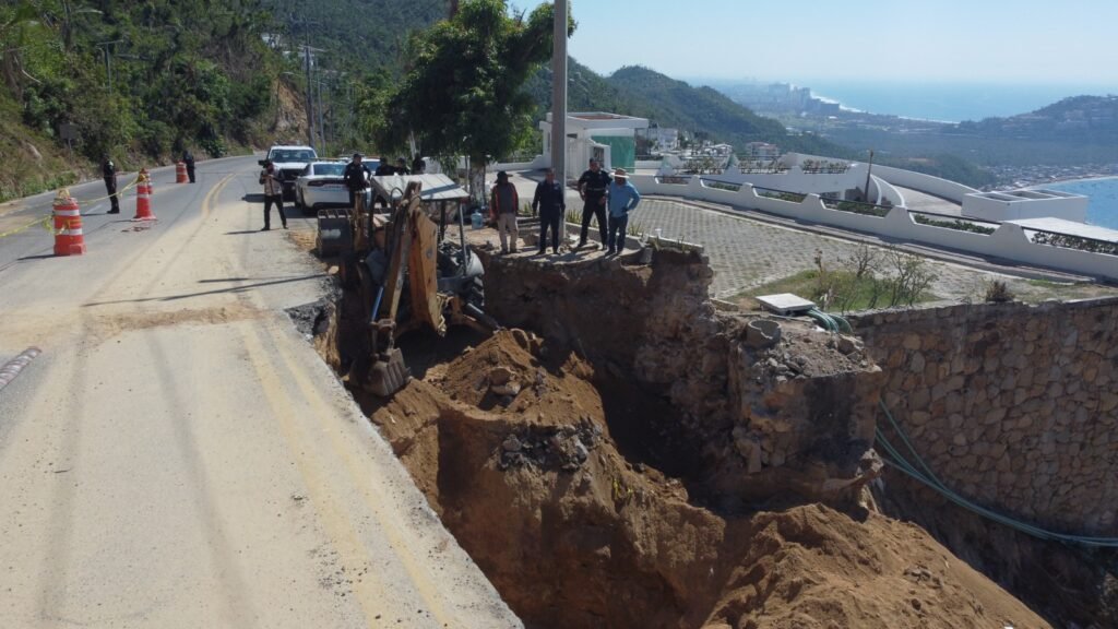 En una acción coordinada entre el gobierno del estado de Guerrero y la Federación, la Comisión de Infraestructura Carretera y Aeroportuaria del Estado de Guerrero (Cicaeg) y el Centro SCT Guerrero están abordando un socavón en la avenida Escénica Clemente Mejía Ávila, específicamente a la altura del Condominio Blue. La situación ha llevado a la restricción del paso de unidades pesadas, permitiendo únicamente la circulación de vehículos ligeros.