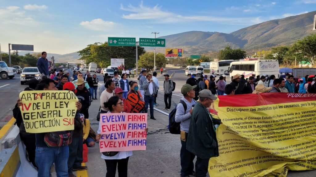 La mañana de este lunes, decenas de maestros, alumnos y padres de familia de la Universidad Intercultural de los Pueblos del Estado de Guerrero (UNIPEG) bloquearon el boulevard Vicente Guerrero a la altura del punto conocido como “El Parador del Marqués”, exigen una mesa de diálogo con autoridades estatales.