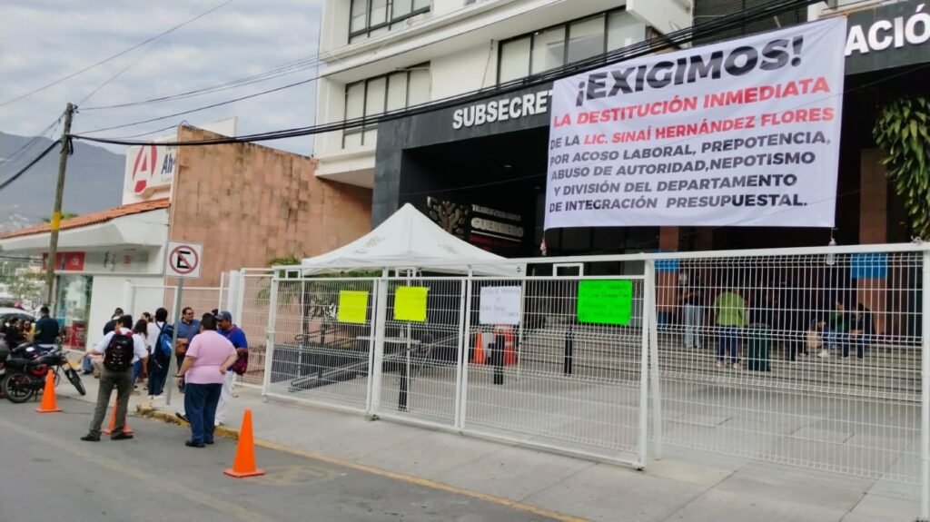 Trabajadores de la Subsecretaría de Administración y Finanzas de la Secretaría de Salud del estado tomaron durante una hora el edificio de la dependencia en Chilpancingo para exigir la destitución de la encargada del Departamento de Integración Presupuestal, Sinaí Flores Hernández.
